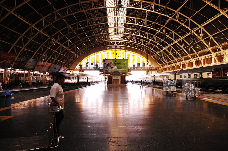 Z lotniska więc bierzemy taksówkę by dotrzeć na dworzec. Zamawiamy ją przez specjalny automat na zewnątrz lotniska – w ten sposób mamy pewność, że taksówkarz nas nie oszuka podając cenę kursu. Warunkiem jest jednak to, że taksówkarz włączy taksometr. Nasz kierowca zapomniał;-), ale mu o tym przypomnieliśmy. Z westchnieniem odkrył urządzenie przykryte szmatką i nasza podróż po Tajlandii tym samym rozpoczęła się na dobre.