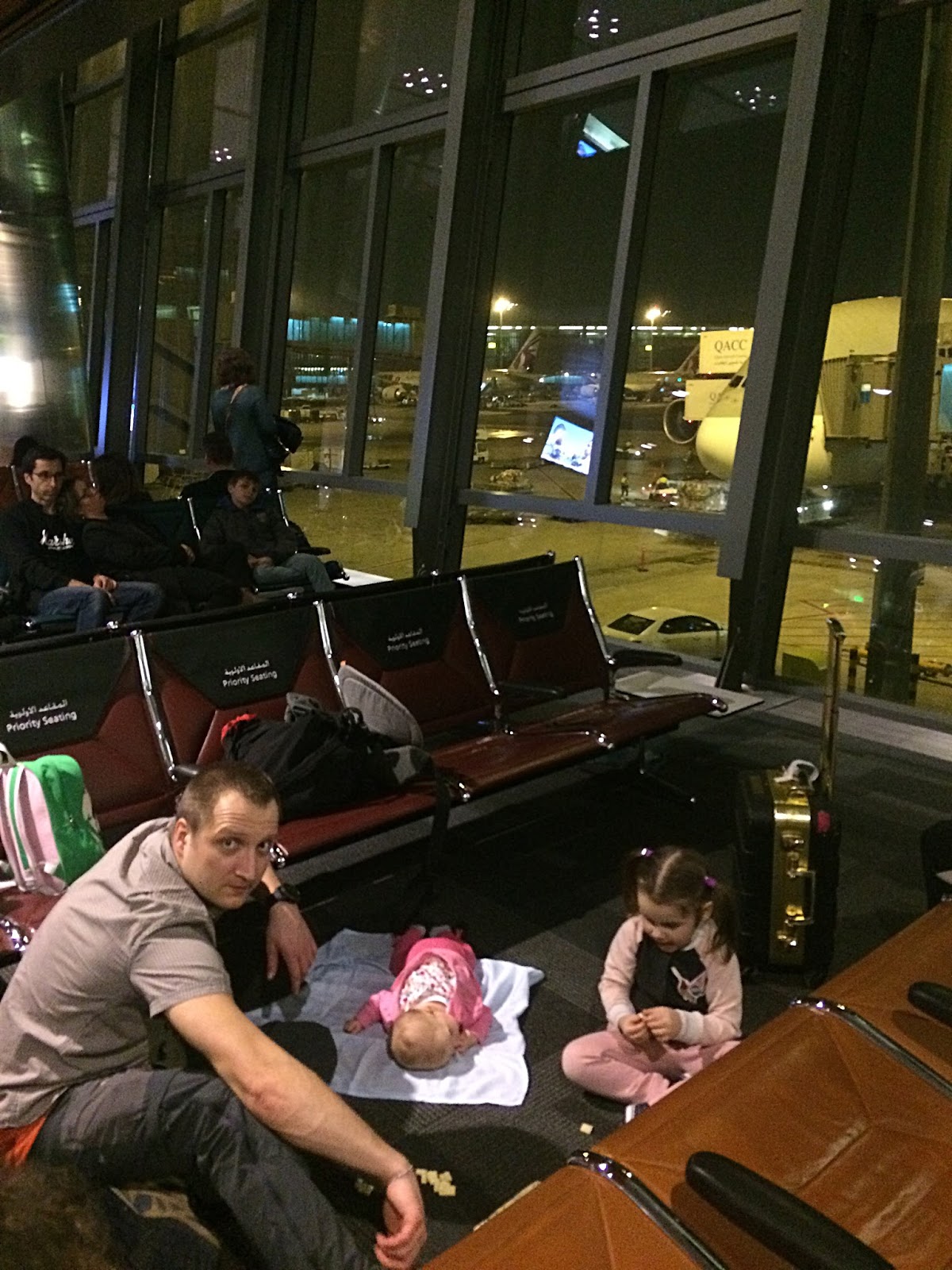 Międzylądowanie mamy w Doha – to lotnisko ma mnóstwo udogodnień dla podróżujących rodzin, jak chociażby wózki dla dzieci, plac zabaw, kąciki z pufami do bawienia się i tulenia, pokoje, w których można się zdrzemnąć i – co już bardziej oczywiste – pomieszczenia do karmienia i przewijania. Drugi lot płynie nam szybciutko – lecimy największym samolotem pasażerskim świata, Airbusem A380. Finalnie to zmęczenie, a nie rodzaj samolotu spowodowało, że przespaliśmy cały lot i o 13:20 czasu tajskiego wylądowaliśmy w Bangkoku.
